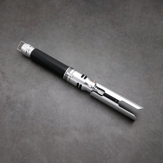 On many of our sabers, two hilts can be connected to create a double-bladed saber, or saberstaff. A hilt connector end piece is needed in order to do this, and several saber styles already come with one on the end of the hilt. It can also be purchased separately. Make sure your lightsaber model is compatible with the piece.