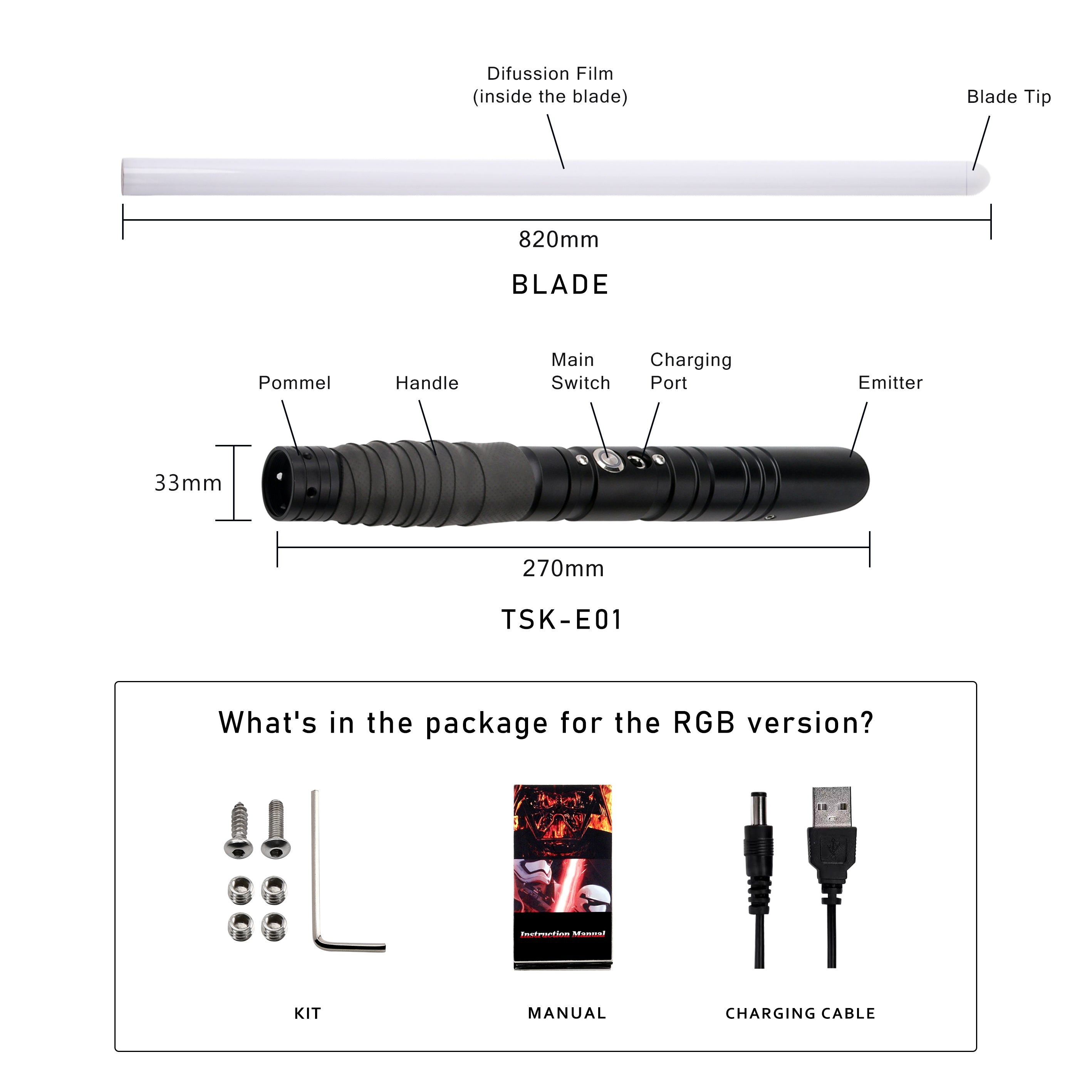 Engineered for serious cosplay and dueling, this tough polycarbonate blade is built to withstand brutal action. Blade colors and FX are easily swapped with a button press or a flick of your wrist, letting you customize your look in seconds. The sound board provides distinct, cinematic audio cues that respond to your every move, while a suite of saber lighting effects delivers dramatic, immersive visuals. The motion sensors are highly responsive, enabling smooth swing ignition and gesture-based starts. In combat, you’ll see a flash-on-clash and a looped lock-up effect that amplifies the intensity of every strike. A rechargeable/removable lithium-ion battery offers all-day cosplay capability, and you can tune the volume or mute it entirely for scenes that call for silence.