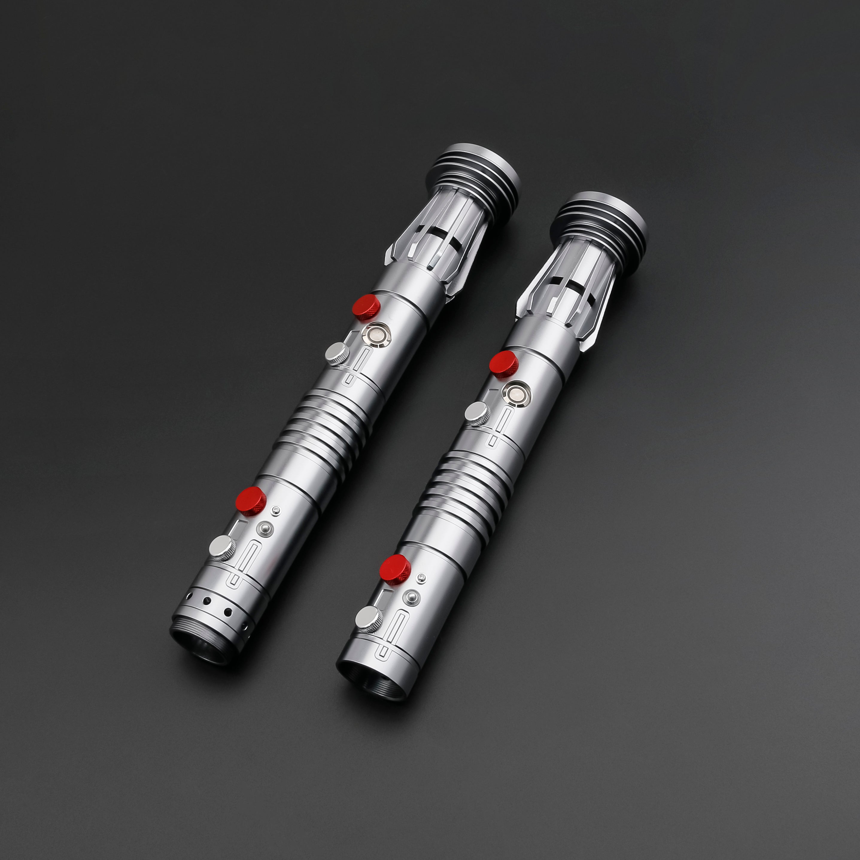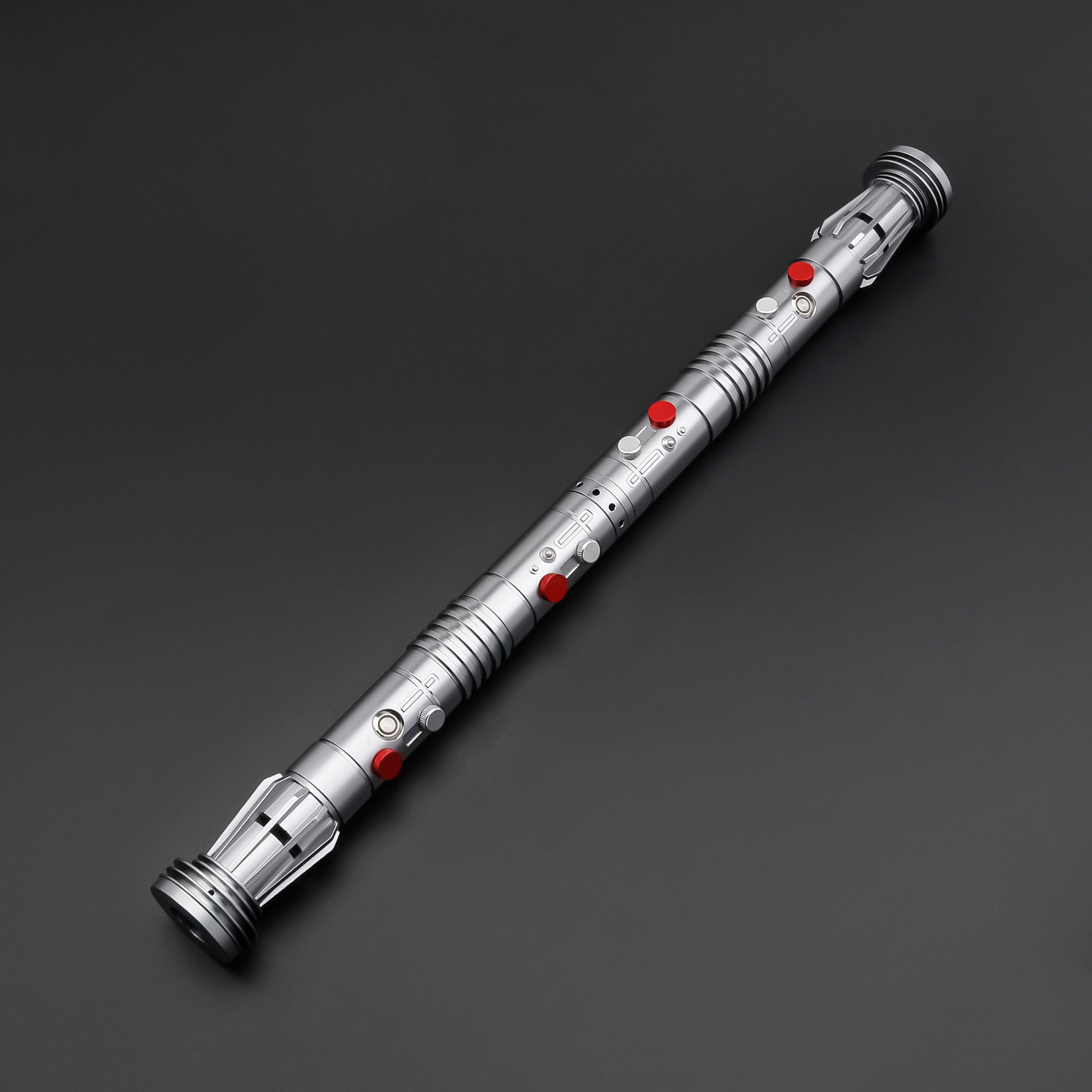 The Darth Maul Special Edition lightsaber offers a refined version of Darth Maul's iconic weapon with distinctive cut-out windows and an elegant silver-grey finish. This affordable double-edged saber features simplified single-button controls while enhancing choreography capabilities, making it ideal for both display and performance use.