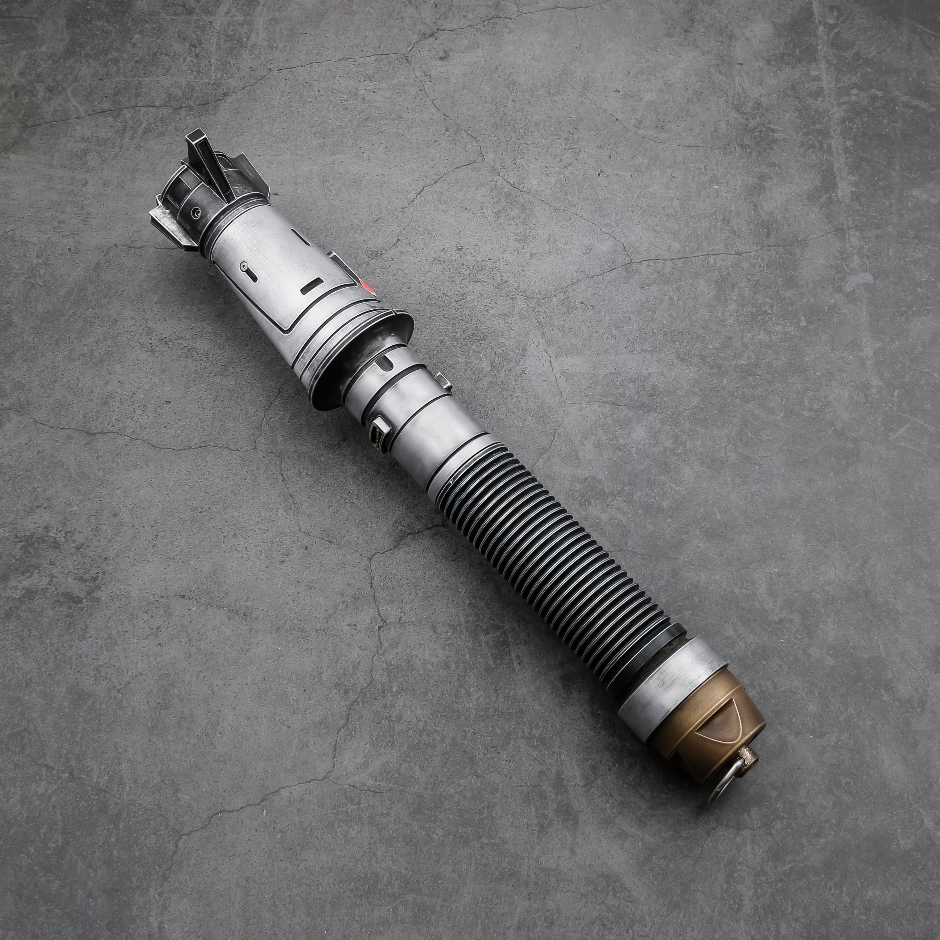 Discover Baylan Skoll's powerful weathered lightsaber. Expertly crafted with precision and iconic design, it features an ergonomic grip for optimal control in combat. The hilt base, made of shiny brass, adds an elegant touch and sets it apart from others. Skoll wielded this lightsaber in battle, defeating New Republic Captain Hayle and numerous soldiers. Testament to Skoll's skills, determination, and deadly efficiency.