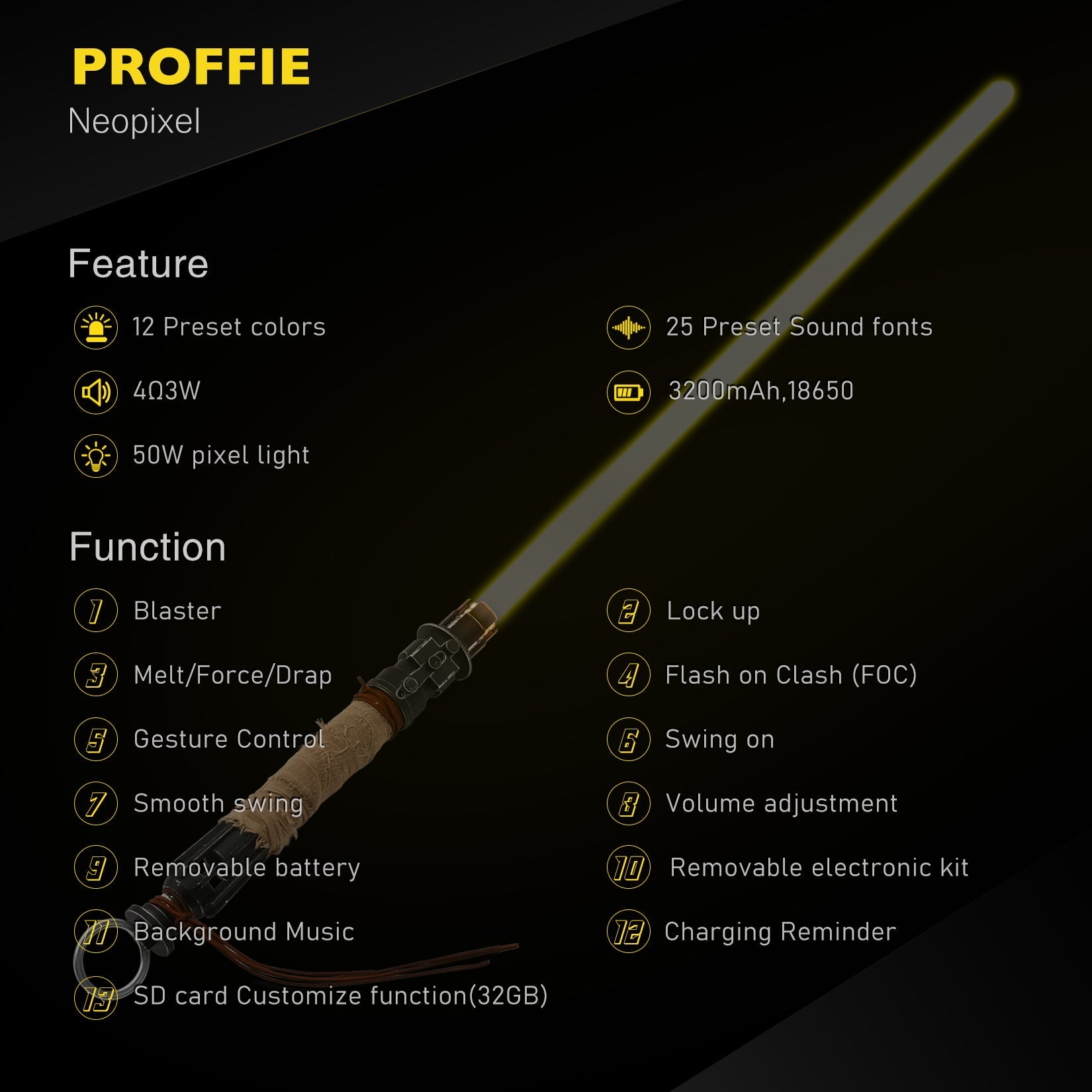 Premium Neopixel Soundboard Realistic sound effects: 27 soundfonts for realistic saber sound effects, character quotes, and iconic music, volume adjustment and mute mode.