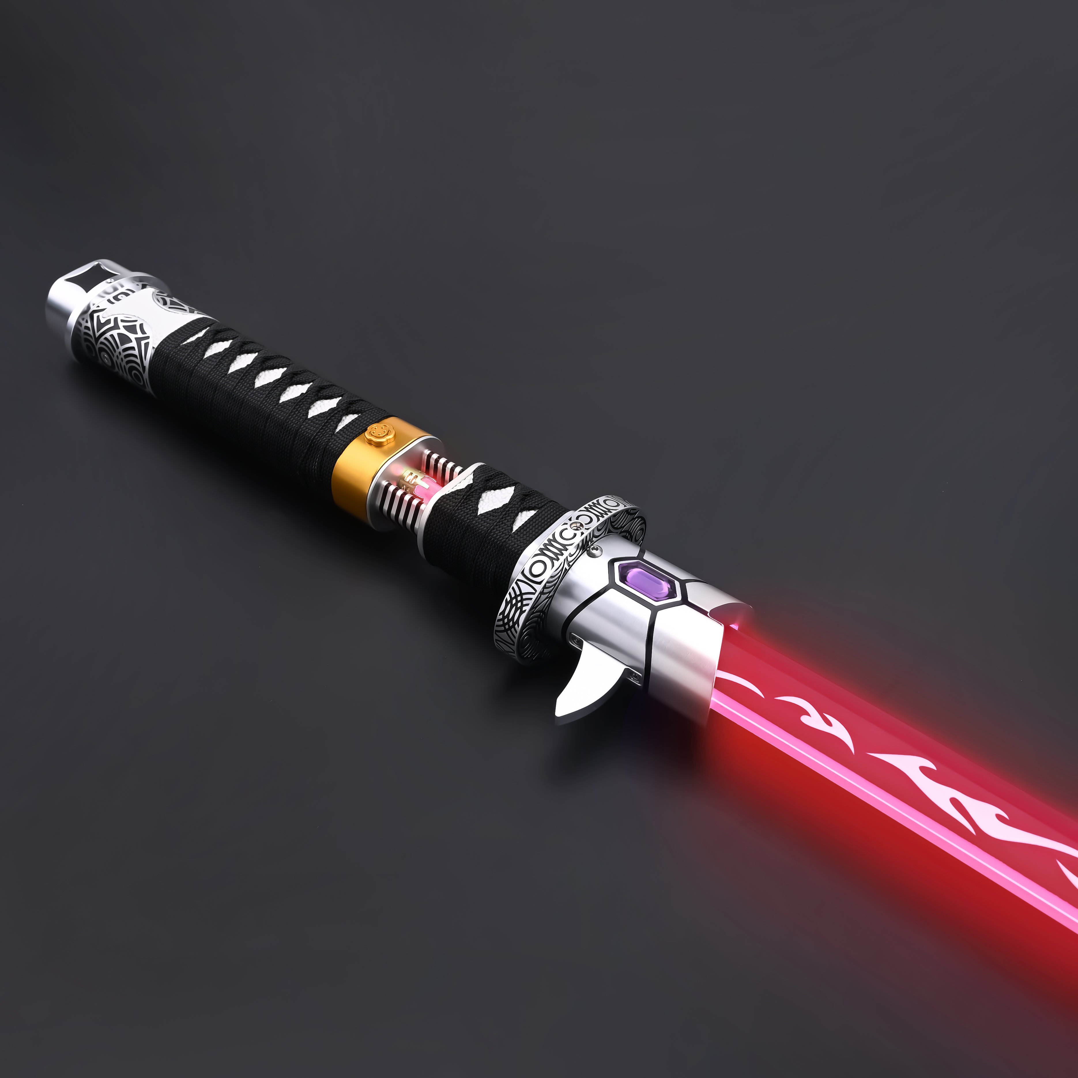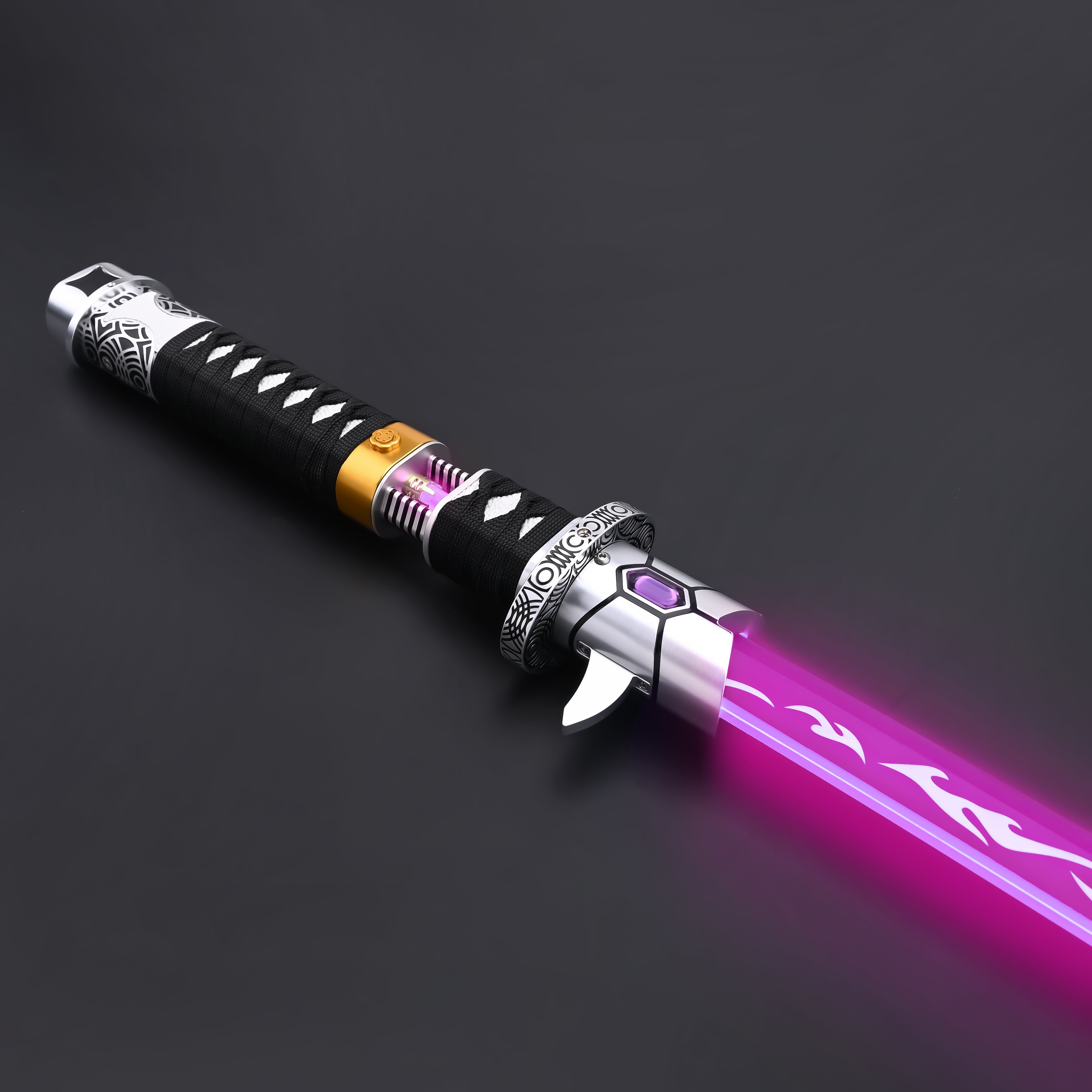 The Shogun lightsaber features a unique hilt inspired by traditional samurai swords, with a black diamond-patterned grip for comfort and control. It includes detailed silver accents and engravings, along with a matching scabbard and sheath. A purple energy core glows beneath polished steel, while subtle lighting in the hilt matches the blade’s color. The guard displays scrollwork inspired by Sith runes. The illuminated inner cavity reveals advanced energy circuits, blending classic design with modern technology, ideal for collectors and users alike.