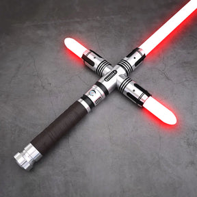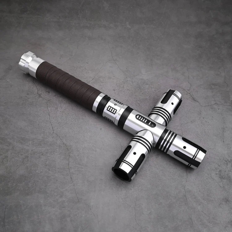 The Defender X is a cross-handle lightsaber built for serious combat. Crafted from aerospace-grade aluminium alloy with reinforced joints and shock-absorbing internals, it delivers durability and wrist protection through intense duels. The Defender X cross-handle lightsaber features side blades for tactical advantage in combat.