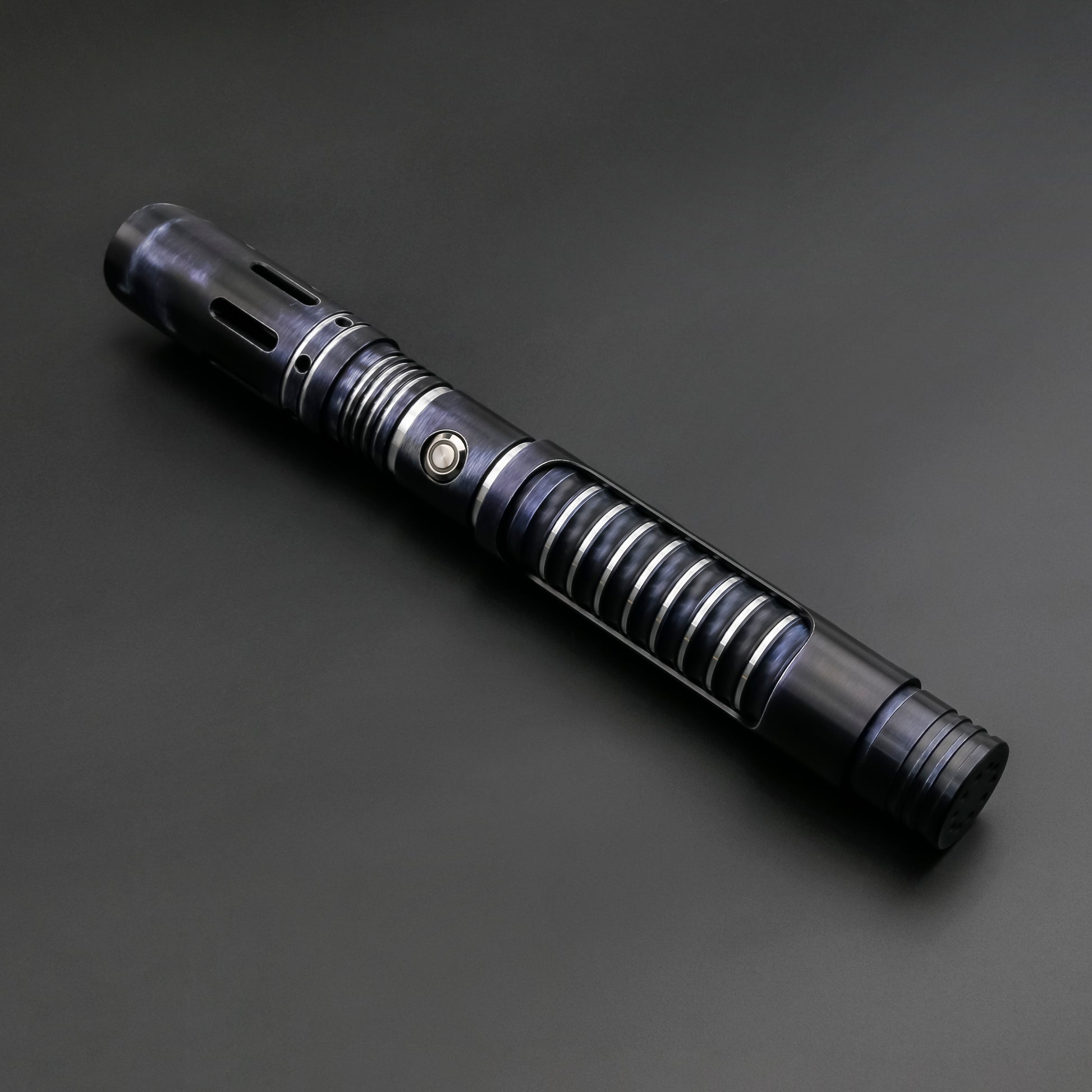 Le sabre laser Dark Jedi est fabriqué avec précision et arbore une fenêtre d'émission finement découpée qui laisse la lumière briller clairement. Sa poignée bleu foncé patinée présente des fraisages détaillés sur l'émetteur et la poignée, tandis que la poignée comprend un manchon amovible pour un style personnalisable. Ce design allie une esthétique sombre et menaçante à une élégance raffinée, le distinguant des autres sabres laser. Des touches argentées ajoutent une touche de luxe, contrastant avec la finition brossée et patinée. Le processus de patine révèle subtilement les nuances bleues sous-jacentes en usant l'extérieur plus sombre.