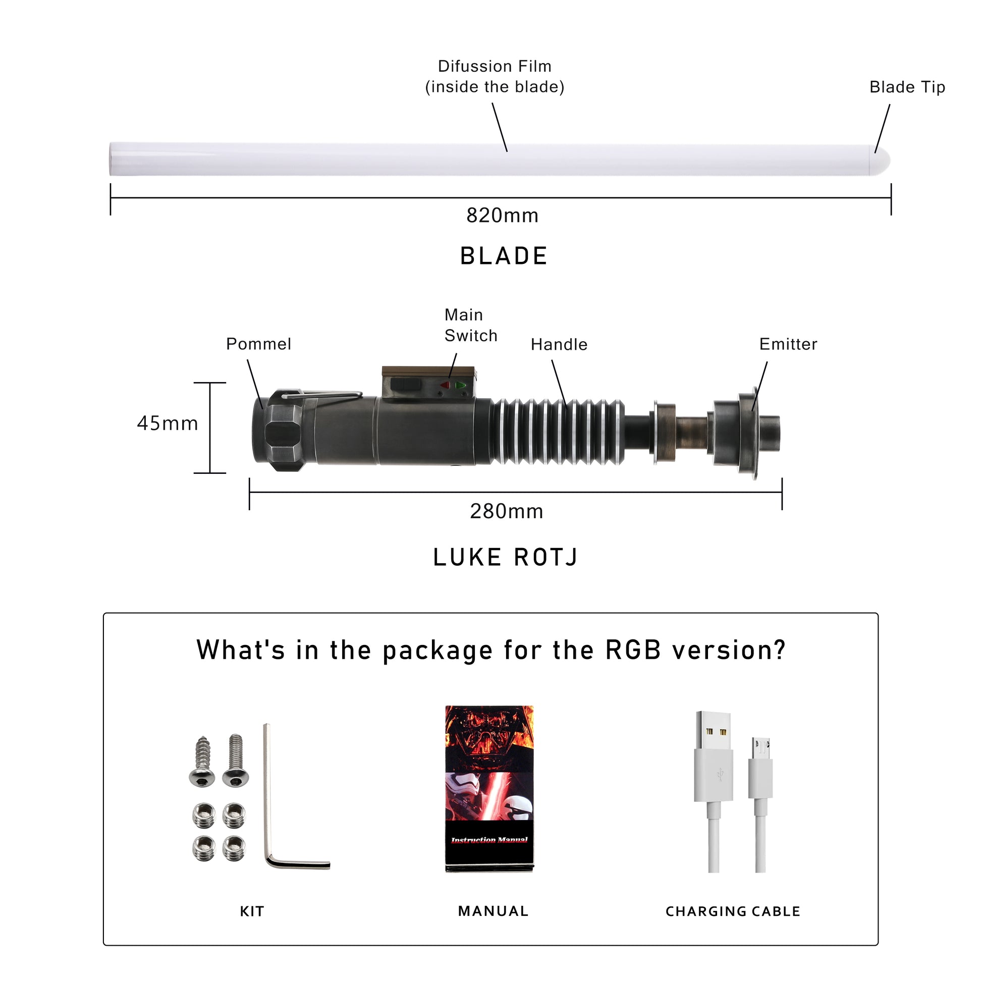 Luke a construit lui-même le sabre laser ROTJ , en utilisant des pièces de l'arme de son père décédé. La poignée présente une finition argentée et un boîtier de commande noir, avec une lame verte. Le sabre laser ROTJ de LUKE a captivé l'imagination de générations de fans de Star Wars, servant de symbole d'héroïsme, d'aventure et de triomphe du bien sur le mal.
