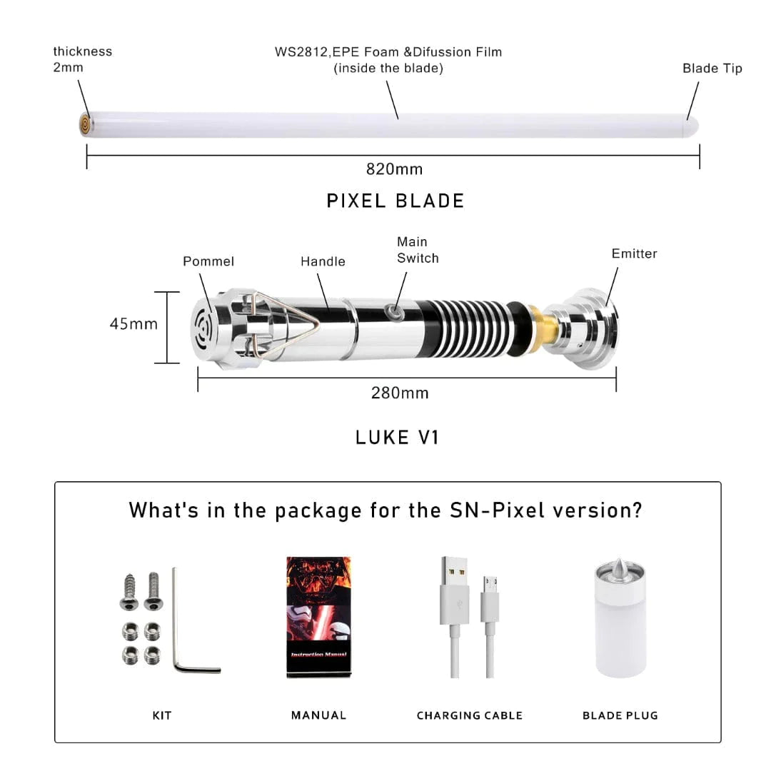 Luke est un hommage au célèbre sabre laser vu pour la première fois dans l'épisode 6. Ce sabre laser est apte à être utilisé par tout aspirant Jedi légendaire. Ce sabre est doté d'une poignée en aluminium poli avec des motifs circulaires et d'un col émetteur allongé, ainsi que d'effets sonores et d'une lame durable avec des capacités de changement de couleur.