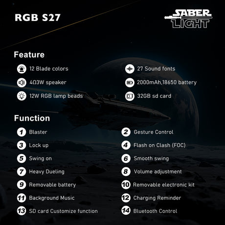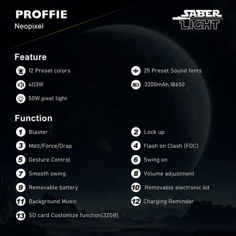Premium Neopixel Soundboard Realistic sound effects: 27 soundfonts for realistic saber sound effects, character quotes, and iconic music, volume adjustment and mute mode.