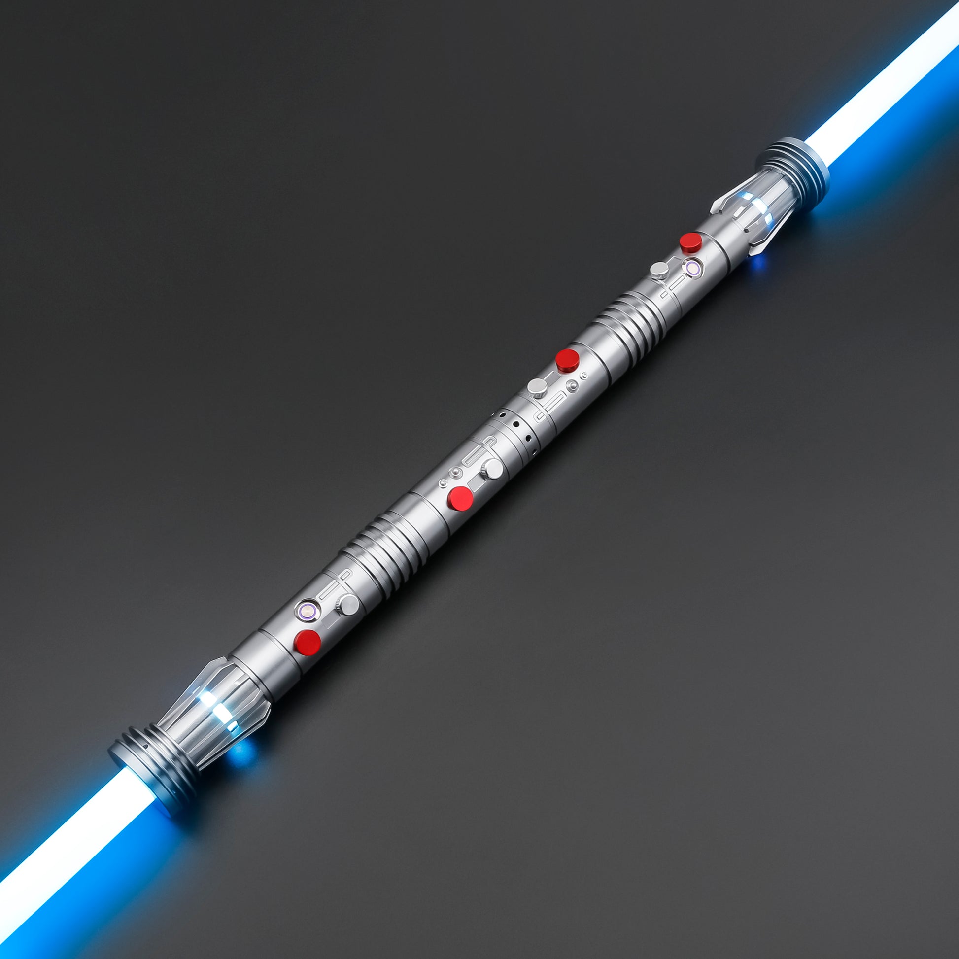 The Darth Maul Special Edition lightsaber offers a refined version of Darth Maul's iconic weapon with distinctive cut-out windows and an elegant silver-grey finish. This affordable double-edged saber features simplified single-button controls while enhancing choreography capabilities, making it ideal for both display and performance use.