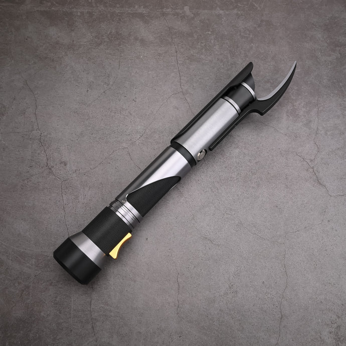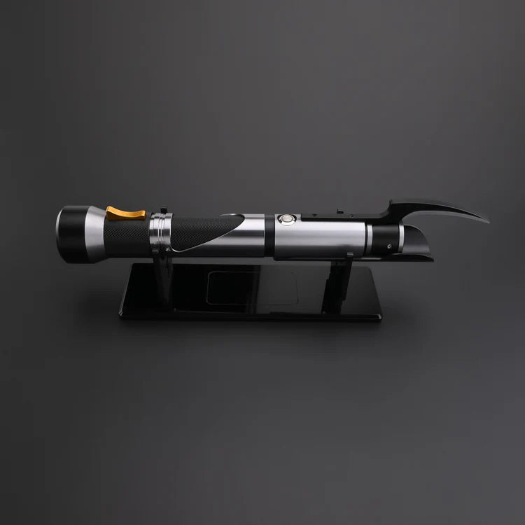 Drawing inspiration from Count Dooku’s iconic saber, the Dooku Special Edition combines elegant design with advanced functionality. Tailored for duelists seeking precision and finesse, it honors the Makashi style but features a unique straight hilt instead of Dooku’s traditional curved design. Crafted from aircraft-grade aluminum alloy, the hilt offers both strength and a premium tactile experience. Its ergonomic shape supports refined wrist movements and fluid blade control, ideal for tight defenses and swift counters. The textured black and white grip ensures comfort and stability, while the contrasting metal and carbon fiber finishes create a striking, battle-ready appearance. The gold control lever adds a subtle yet sophisticated detail, blending luxury with authentic functionality.